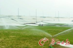 但连日来,记者前往现场时发现,占地面积一千多亩的高尔夫球场里每天均有数十名工人在忙碌着给草皮浇水、施肥等,场内立起了无数的灯光杆。工人称,场内大面积覆盖着一层白色的塑料薄膜,是用来保护刚种下不久的草皮的,起保湿、确保水分作用,球场设施等已基本建好……国土资源部门: