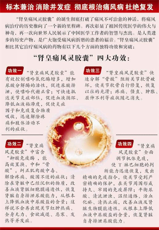 “肾皇痛风灵胶囊”的诞生彻底打破了痛风不可治愈的神话,将痛风病治疗的历史推向了一个新的里程碑。再次彰显了祖国传统医学的伟大与神奇,再一次向世界人民展示了中国医学工作者的智慧与杰出。是人类进步的历史产物,是广大饱受痛风病折磨的患者的福音。“肾皇痛风灵胶囊”相比其它治疗痛风病的药物有以下几个方面的独特功效和突破;
