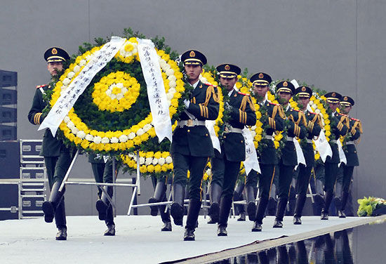 12月13日,武警国旗护卫队战士向南京大屠杀遇难同胞敬献花圈本报(微博)驻日本特约记者 李 珍 本报记者 王 渠12月13日是南京大屠杀同胞遇难74周年纪念日。国际上对此很关注,英国广播公司等西方媒体都进行了报道。相比之下,日本国内对此事的报道较为低调。共同社等日本主流媒体仅就悼念活动进行了简单报道。《产经新闻》等部分媒体则在报道中强调“日中在大屠杀人数上有分歧”。清华大学日本问题专家刘江永13日接受《环球时报》记者采访时表示,这是日本一种“自我遗忘”的表现,但这不能抹杀历史真相。