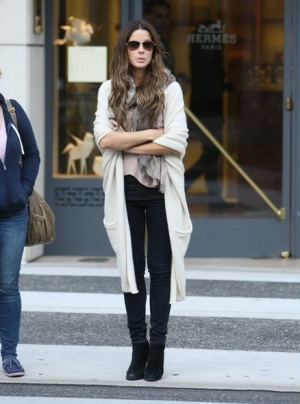 Jessica Alba同是长款开衫毛衣,下摆不规则,长长的围巾置于胸前,下摆与外套有着异曲同工之妙,下半身为小脚裤+高筒靴,冬日显瘦经典搭配,虽然没有亮眼的色彩,但是整体搭配相当拉风,让人忍不住多看一眼。