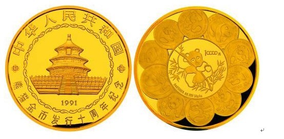 1991年是中国熊猫金币发行10周年(此为按年号计算)。熊猫金币作为我国的代表性名牌产品,已挤身于世界著名普制币前列,为了纪念中国熊猫金币发行10周年,也为了向世界展现中国的名牌产品及造币技术,中国人民银行决定发行5公斤熊猫金币。值得一提的是该币背面图案除了传统的熊猫图案以外,还将10年来每年发行的熊猫币的不同图案铸于币上,设计雕刻异常精美,发行量仅为10枚,均在海外发行,受到世界人民银热烈欢迎。
