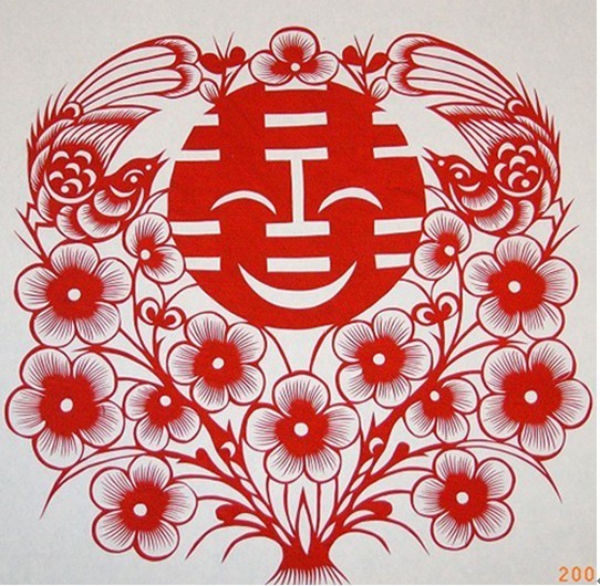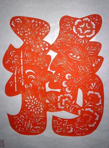 就拿中国剪纸中常见的 “福”字为例,钟安霞没有将它简单地剪成一个古拙的篆字,或遒劲的隶书,而是匠心独具地剪成一个康熙字体的“情侣福”——左边的礻部像一个展翅的飞天美女,右边的“畗”则是一个形似戴帽的老者。一老一少,美女老人,一动一静,配以梅、兰、竹、菊,凤凰牡丹的渲染,使这个“情侣福”字,厚重中透露出潇洒,浪漫里显现出高雅,给人一种典雅悠远的想象。