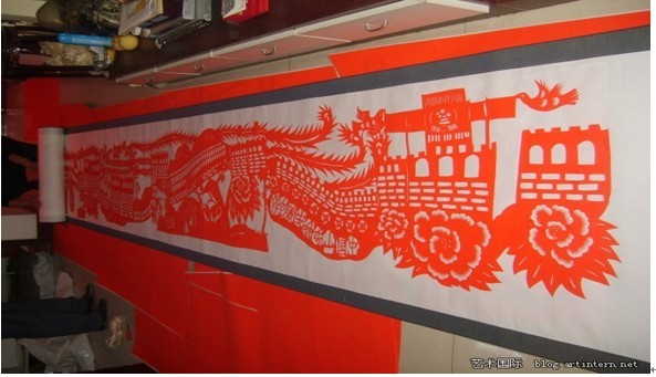 花盛世凤舞九州”,21米长卷十二月花神,7米长卷奥运中国,33米长卷凤舞九天,108水浒人物;清明上河图;500罗汉等等,都是她用小剪刀对历史的独特解读。值得一提的是:去年,钟安霞的百米长卷“龙凤中国”被中南海珍收藏后,她又致力于万米剪纸长卷“华夏中华”的创作,她要用自己独有的剪纸语言,解读中国上下五千年的历史,解读中国上下五千年的文化。这宏大的工程,在中国剪纸史上,可以说前无古人,后也未必会有来者。