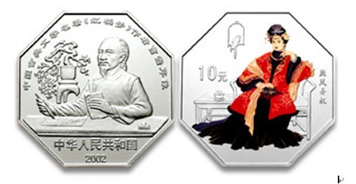 中国人民银行定于2002年9月3日发行中国古典文学名著《红楼梦》彩色金银纪念币(第二组)一套。该套纪念币共6枚,其中金币1枚,银币5枚,均为中华人民共和国法定货币。 1盎司彩色纪念银币(4枚)背面图案分别为元春归省图、惜春作画图、熙凤弄权图、宝钗扑蝶图,并刊面额。 1盎司彩色纪念银币(4枚)为精制币,每枚含纯银1盎司,形状均为八边形,外接圆直径均为40毫米,面额均为10元,成色均为99.9%,发行量均为38000枚。 (供稿:北京银协集币服务中心)