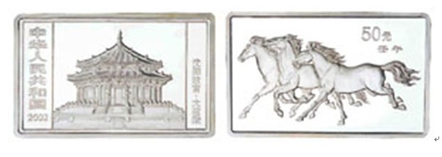 盎司长方形银币为精制币,含纯银5盎司,成色99.9%,规格50毫米×80毫米,面额50元,发行量1888枚。