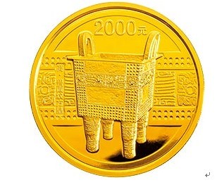 中国人民银行于 2012 8 月发行中国青铜金银纪念币 ( 1 ) 一套 , 该套纪念币共 5 枚,其中 5 盎司金币为圆形精制币,直径 60 毫米,成色 99.9% ,面额 2000 元,最大发行量 2000 枚。 正面图案为中华人民共和国国徽,并刊国名、年号 , 背面图案为商代兽面纹方鼎,衬以该器物兽面纹 样等装饰组合设计,并刊 · 兽面纹方鼎 字样及面额 2000 .