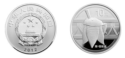 中国人民银行发行了一套以中国青铜器为题材的贵金属纪念币,其中1盎司银币的主题便是商弦纹盉。图为1盎司圆形银质纪念精制币,含纯银1盎司,直径40毫米,面额10元,成色99.9%,最大发行量为80000枚。此枚纪念币正面图案为中华人民共和国国徽,并刊国名、年号。背面图案为商代弦纹盉,衬以该器物弦纹样等装饰组合设计,并刊“商•弦纹盉”字样及面额。