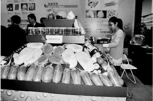 昨日上午,记者一进入农博会现场就被各式各样、五颜六色的蔬菜瓜果所吸引。一个展位上黑色的大蒜引起了许多参观者的兴趣。这种大蒜不仅外皮是黑的,就连剥出的蒜瓣儿也是纯黑色的,记者尝了一瓣儿,发现黑蒜与普通的白皮蒜或紫皮蒜相比,口感没有那么辛辣,但是也有蒜香味,吃起来像是腌制过。这种黑蒜可不便宜,一包12头要160多元,平均一头就要十几块。而且还衍生出了黑蒜泥、黑蒜米、黑蒜胶囊等产品,也都身价不菲。工作人员介绍说:黑蒜有预防癌症、心脑血管疾病,调节血糖保护肝脏、促进毛发增长、抗衰老、增强体力等诸多功能。