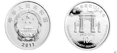 该币正面图案为中华人民共和国国徽,并刊国名、年号。背面图案为清华大学“二校门”建筑造型, 并刊“清华大学建校100周年”中文字样、“TSINGHUA UNIVERSITY CENTENARY CELEBRATION”英文字样和“1911-2011”字样及面额。 背面图案取币面的正中轴线为参照,全部内容均居中展开,首先是上端的“清华大学建校100周年”中文字样和下端“TSINGHUA UNIVERSITY CENTENARY CELEBRATION”英文字样同构而成一个圆形,中英文对照,更好地向外国友人传达清华大学百年校庆的讯息,点明主题。位于币面的正中央,中西合璧风格的三拱牌坊式建筑——清华大学“二校门”,以其建筑造型作为币图的主角,对称的“二校门”造型采用反喷砂的工艺,塑造了一个写实古朴的精美造型。中间大 拱门两侧各嵌建的两根陶立克西式立柱清晰可见,建筑上的条纹细腻,清楚可见,凸显了铸造工艺的精湛高超。校门造型的下面辅以阿拉伯数字“1911— 2011”,强化了清华大学建校100周年的纪念意义,年份下面印刻有“10元” 面额字样。图案整体简洁美观,工艺精湛,主题明确。