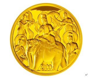中国人民银行于2010年8月发行中国石窟艺术(云冈)金银纪念币一套, 该套纪念币共5枚,金币3枚, 银币2枚,均为国家法定货币。该套纪念币正面图案为云冈石窟外景,并刊国名,年号及“中国石窟艺术*云冈”中文字样。其中5盎司纪念金币为圆型,直径60毫米,面额2000元,成色99.9%,最大发行量800枚。币的背面图案是太子乘象回城造型。该币取自云冈石窟第6窟,窟平面近方形,中央是一个连接窟顶的两层方形塔柱,高约15米。塔柱下面叫层大龛,南面雕坐佛像,西面雕倚坐佛像,北面雕释迎多宝对坐像,东面雕交脚弥勒像。塔柱四面大龛两侧和窟东、南、西三壁以及明窗两侧,雕出33幅描写释迦牟尼从诞生到成道的佛传故事浮雕。此窟规模宏伟,雕饰富丽,技法精炼,是云冈石窟中最有代表性的一个。