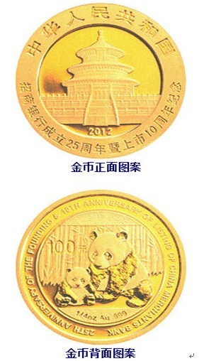 中国人民银行定于2012年10月26日发行招商银行成立25周年暨上市10周年熊猫加字金银纪念币一套。该套纪念币共2枚,其中金币1枚,银币1枚,均为中华人民共和国法定货币。该套金银纪念币正面图案均为北京天坛祈年殿,并刊国名、年号及“招商银行成立25周年暨上市10周年纪念”中文字样。1/4盎司圆形金质纪念币背面图案为母子熊猫图,并刊“1/4oz Au .999”字样、“招商银行成立25周年暨上市10周年纪念”英文字样及面额。1/4盎司圆形金质纪念币为普制币,含纯金1/4盎司,直径22毫米,面额100元,成色99.9%,最大发行量20000枚。供稿:北京银协集币服务中心