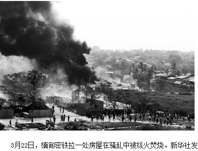 缅甸中部城市密铁拉骚乱22日进入第三天,迄今已造成数十人伤亡。缅甸总统吴登盛当天宣布密铁拉等4个中部城镇进入紧急状态。
