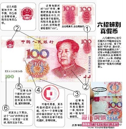 1、摸人像、盲文点、中国人民银行行名等处是否有凹凸感。第五套人民币纸币各券别正面胶印图案中,多处均印有微缩文字,20元纸币背面也有该防伪措施。100元微缩文字为“RMB”和“RMB100”;50元为“50”和“RMB50”;20元为“RMB20”;10元为“RMB10”5元为“RMB5”和“5”字样。 二摸:2、摸纸币是否薄厚适中,挺括度好。 三听: 即通过抖动钞票使其发出声响,根据声音来分辨人民币真伪。人民币的纸张,具有挺括、耐折、不易撕裂的特点。手持钞票用力抖动、手指轻弹或两手一张一弛轻轻对称拉动,能听到清脆响亮的声音。