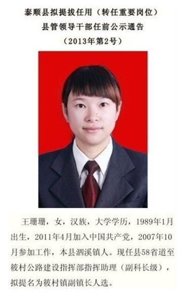 本网记者经查证泰顺县政务网关于泰顺县拟提拔任用(转任重要岗位)县管领导干部任前公示通告(2013年第2号),却有王珊珊其人。浙江在线2011年曾报道《网曝89年公务员拟任副科级 当事人称四岁上小学》一文在社会引起极大争论,现如今王珊珊已转正。