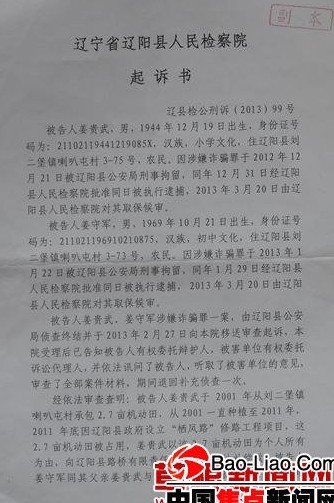 就在姜家被砸的第二天,被打伤的姜贵武还没等看病,他和儿子姜守军父子再次被公安局抓走,罪名仍然是涉嫌诈骗。目前,辽阳县检察院已经以涉嫌诈骗的罪名对姜家父子提起公诉。辽阳县检察院起诉书(辽县检公刑诉【2013】99号)中说:经依法审查查明:被告人姜贵武于2 0 0 1年从刘二垡镇喇叭屯村承包2.7亩机动田,从2001一直种植至201年。2011年底因辽阳县政府设立“栖凤路”修路工程项目,这2.7亩机动田被占用,姜贵武以该2.7亩机动田为个人所有为由,向辽阳县路桥有限责任公司索要占地补偿款,被告人姜守军同其父亲姜贵武与辽阳县路桥有限责任公司签占地补偿协议书,于2012年12月12日得到占地补偿款,姜贵武得125000元,姜守军以青苗补偿的名义诈骗12500元。另外,被告人姜贵武、姜守军在已按每亩5万元补偿标准领取到6亩多口粮田补偿款的情况下,仍多次阻止施工,多要补偿款。为尽快施工,辽阳县路桥有限责任公司不得已于2012年12月12日又多支付二人每亩3万元的补偿款20余万元。本院认为,被告人姜贵武、姜守军以非法占有为目的,骗取数额巨大的集体财产,二人的行为已触犯《中华人民共和国刑法》第二百六十六条之规定,犯罪事实清楚,证据确实充分,应以诈骗罪追究刑事责任,根据《中华人民共和国刑事诉讼法》第一百七十二条之规定,提起公诉,请依法判处。