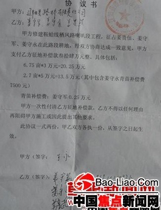 据村民们介绍:今年已经70多岁的姜贵武,在喇叭村是个有点影响力的人物,他当过小队长,又曾经多次与村书记叫板并且胜诉。这次征地,据称在没出具任何审批手续的情况下,20 1 2年5月1 9日(星期六),在村书记栗荣贵带领下,镇政府的副镇长和经济局的局长及派出所副所长谢宝春等二十余人把姜家的几口人抬到一边,在警察的保护下,挖掘机就强行侵占了他家的7亩多地。他当然又要站出来与栗荣贵为代表的村委会、镇政府理论理论,他就自然而然的成了村民中敢于挑战征地的英雄。但是,多次上访后,镇政府并没有拿出来土地审批手续,只拿出来一份县政府文件(辽证发(2012-55号),说这就是审批手续,还是补偿标准文件。姜贵武等村民认为这次征地属于违法征地,就多次向上级有关部门反映镇政府违法侵占土地一事。为了安抚住姜贵武,镇政府多次派人与姜贵武谈判。在1 2月初的一天,在镇政府406房间,由镇信访办主任杨丽梅出面,双方终于达成共识,201 2年12月12日8点29分,杨丽梅打电话通知姜贵武家,去镇政府领取土地补偿款,姜贵武与路桥公司签订了征地补偿协议,对方将有姜守军名字的一张银行存折交给了姜贵武家。同日,姜贵武家又在镇政府楼上财务办公室,领到了另外一部分土地补偿款,还是存折。