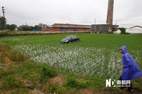 昨日下午1时,在全日辉家厂房外,南都记者看到,黄瑞珍驾车载儿女逃命的小轿车已经离开路面,车身掉在旁边十多米外的一片稻田中间。