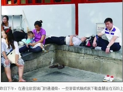 为什么:可能是逛了一上午景区比较累,又加上天气以晴间多云为主,许多游客选择在景区的长廊、座椅、树荫下休息、进食。比如昨日下午在天坛公园,记者就发现不少游人不顾形象自顾自地脱了鞋,侧躺在长廊上休息,甚至有人干脆在脸上盖个帽子,伸直了腿在长廊上睡个午觉。