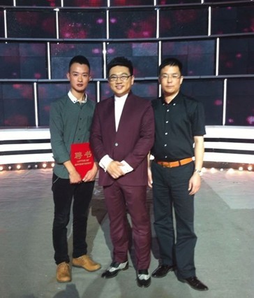 中国第三位男催乳师杨军先生、上海东方卫视首席主持人骆新先生、金领伟业集团总经理梁云先生亲切合影(从左至右介绍) 金领伟业集团为杨军先生颁发的聘书