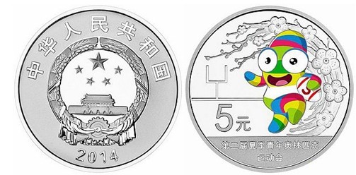 中国人民银行定于2014年2月28日发行第二届夏季青年奥林匹克运动会金银纪念币一套。该套纪念币共4枚,其中金币1枚,银币3枚,均为中华人民共和国法定货币。 纪念币图案 正面图案。 该套金银纪念币正面图案均为中华人民共和国国徽,并刊国名、年号。 背面图案。 7.776克(1/4盎司)圆形金质纪念币背面图案为标准吉祥物造型衬以跑道图案组合设计,并刊“第二届夏季青年奥林匹克运动会”字样及面额。 155.52克(5盎司)圆形银质纪念币背面图案为会徽衬以南京城门、云锦图案等组合设计,并刊“第二届夏季青年奥林匹克运动会”字样及面额。 15.552克(1/2盎司)圆形银质纪念币背面图案之一为高尔夫球运动吉祥物造型,衬以装饰梅花图案等组合设计,并刊“第二届夏季青年奥林匹克运动会”字样及面额。 15.552克(1/2盎司)圆形银质纪念币背面图案之二为橄榄球运动吉祥物造型,衬以装饰梅花图案等组合设计,并刊“第二届夏季青年奥林匹克运动会”字样及面额。 纪念币规格和发行量 7.776克(1/4盎司)圆形金质纪念币为精制币,含纯金7.776克(1/4盎司),直径22毫米,面额100元,成色99.9%,最大发行量10000枚。 155.52克(5盎司)圆形银质纪念币为精制币,含纯银155.52克(5盎司),直径70毫米,面额50元,成色99.9%,最大发行量2000枚。 15.552克(1/2盎司)圆形银质纪念币为精制币(2枚),每枚含纯银15.552克(1/2盎司),直径33毫米,面额5元,成色99.9%,最大发行量各20000枚。 该套金银纪念币分别由深圳国宝造币有限公司、沈阳造币有限公司和上海造币有限公司铸造,中国金币总公司总经销。 北京银协集币服务中心