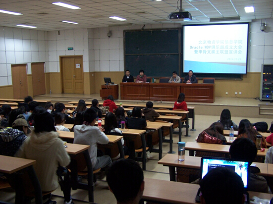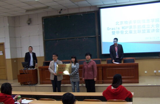 继CUUG主办成功主办第二届Oracle 2014校企合作院长峰会后, CUUG培训中心大力开展校企合作,先后与全国多家高校建立密切合作关系,提供力所能及的资源。目前已经帮助北京工商大学、山西大学、河北建筑工程学院、燕京理工大学、湖南工程学院等多所高校举办Oracle宣讲、成立Oracle学习俱乐部、建立机房,派遣一线工工程师到校园讲师开设Oracle实训课程等等。2014年10月29日,Oracle 华北区经理戎鹏、CUUG培训中心张军辉校长、市场部刘学总监来到北京物资学院举办了宣讲活动和Oracle WDP俱乐部的授牌仪式。