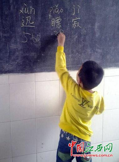 昨日下午,文埠小学谢瑜校长当众抽出一本书,并从中挑出“迅、瞟、寂”三个字,并将三个字的音节写到黑板上。“柯柯,你能把这三个字的音节数字页码写出来吗?”谢瑜校长话音刚落,左手拿着粉笔的柯柯,立马在三个字的下方写出了新华字典内相对应的音节数字页码。众人现场对照发现,柯柯写出的数字完全正确。
