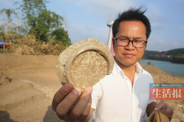 在现场,一工作人员给记者展示了一枚刚出土的铜钱,该枚铜钱只有人的食指般大小。据工作人员介绍,像这类的铜钱目前已经发掘出了十枚,铜钱散落在发掘遗址的各个角落,除了铜钱外,考古人员还揭露了部分青砖砌筑的建筑基址,地层中也出土了少量的生活用陶瓷残片。由此推断,镇江楼遗址在清代时曾有人住宿和生活过,这和史料中关于镇江楼常设驻军的记载相符。据黎文宗介绍,2014年时考古队曾对镇江楼遗址进行全面调查,2016年开始试掘,此前,镇江楼遗址因受左江南岸河岸崩塌以及老口枢纽建成水位抬升的影响,三江口镇江楼遗址面临崩塌、消亡的危险。