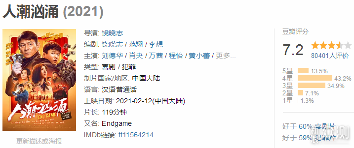 豆瓣7.2分,评价人数超8万人,四星好评占比最高,约为43%,一星差评最低,可以看出,该片的争议声并不大。