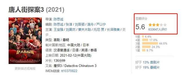 反观同是贺岁档上映的《唐人街探案3》,上映既是巅峰,预售成绩创新高之后,票房便开始了断崖式下跌,很大程度则是因为口碑不理想。而电影的评分也是从开分的及格线一路跌到5.6分,垫底了整个唐探系列。
