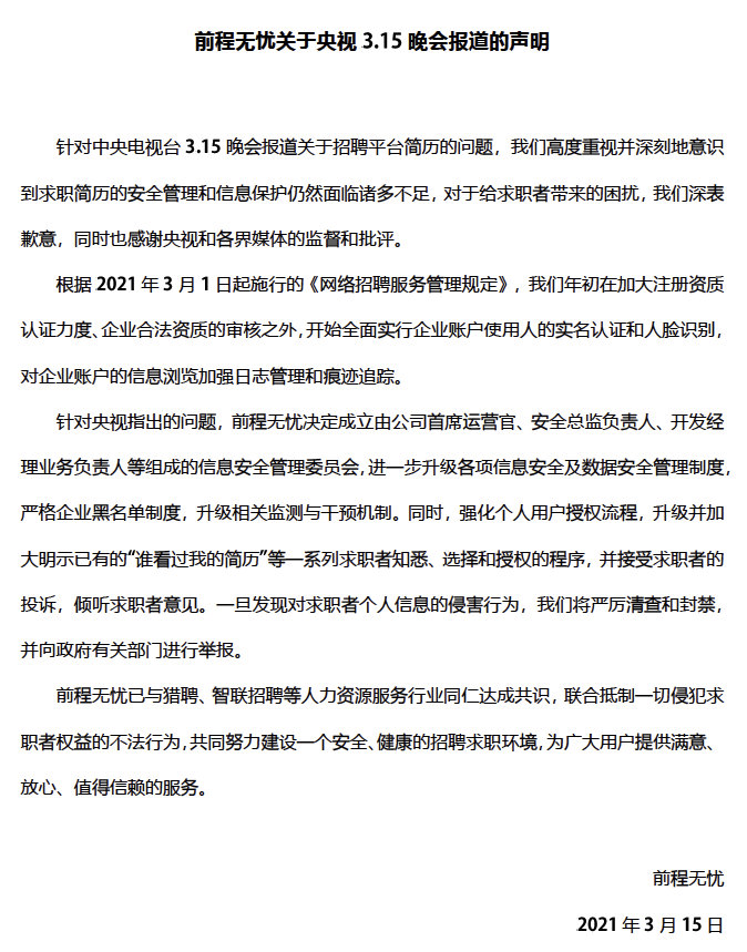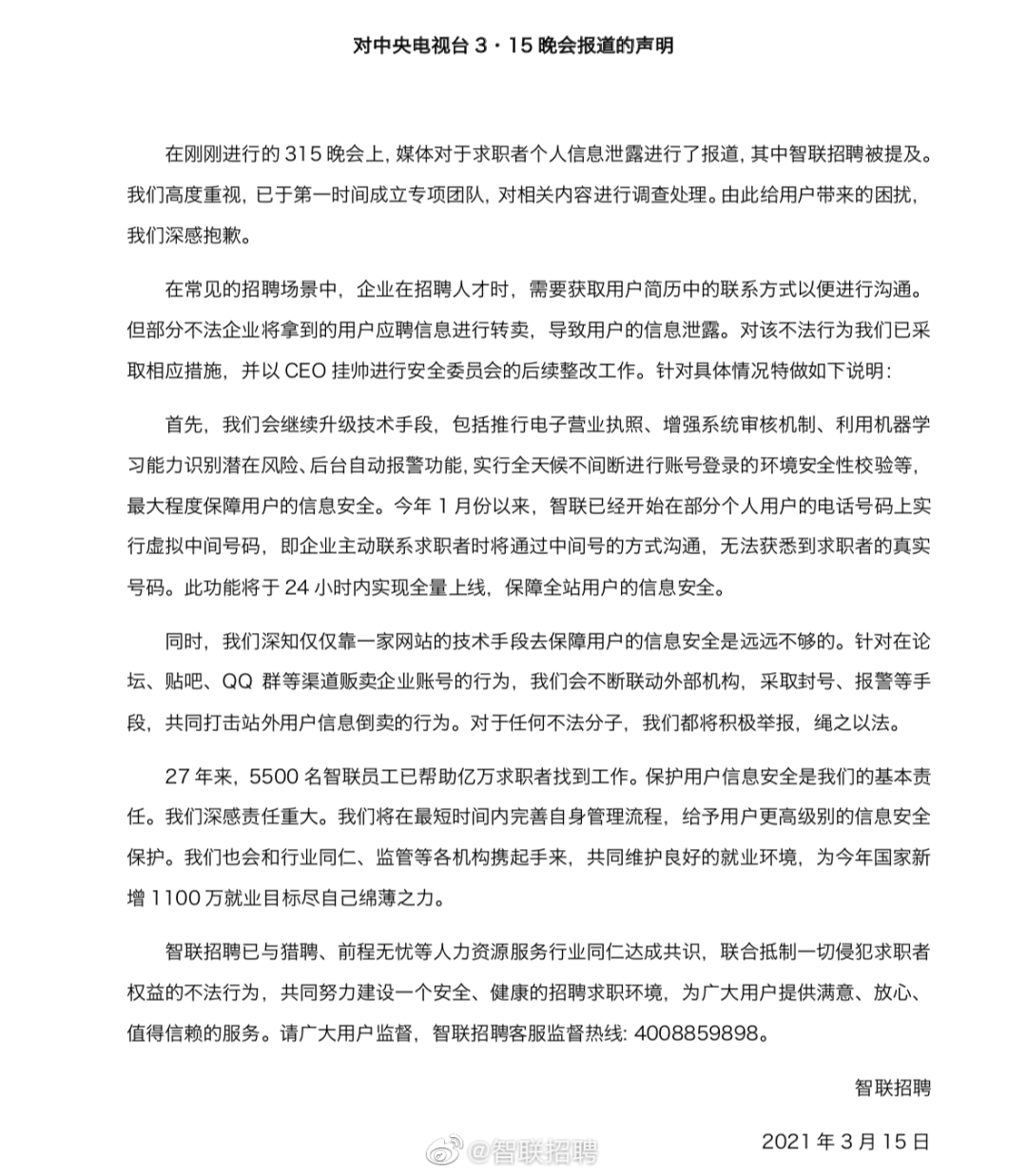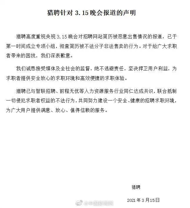 针对央视“3.15”晚会提到的“消费者简历流入黑市”一事,三家招聘平台做出回应。