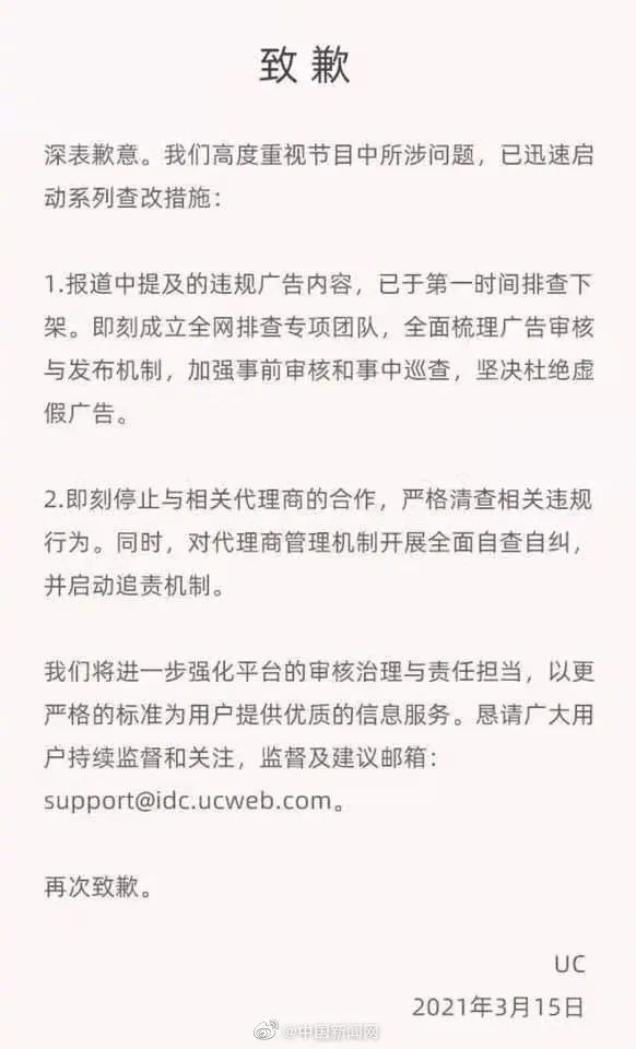 UC回应:高度重视节目中所涉问题,为违规广告带来的不良影响向公众致歉,第一时间排查下架违规广告内容,并迅速成立全网排查专项团队,加强对广告投放的事前审核和事中巡查。